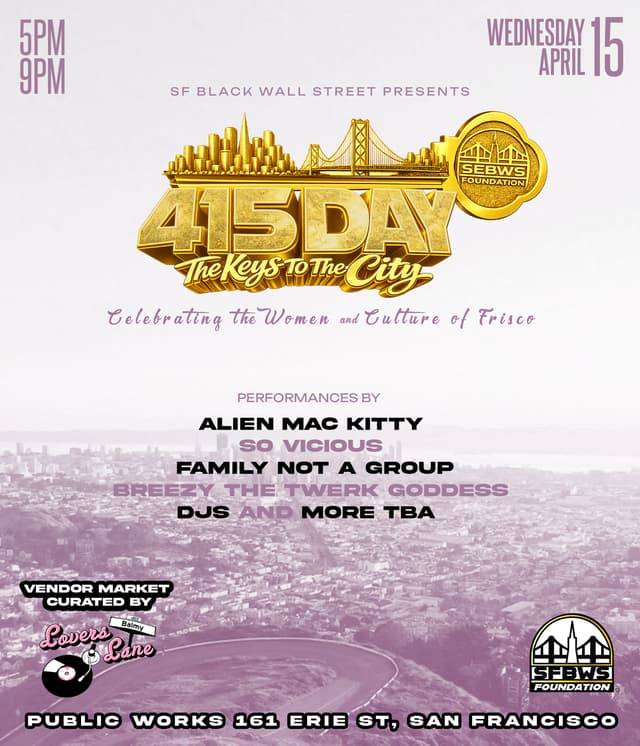 Come shop in person at the 415 Day The Keys to the City Market. Celebrating the women and culture of Frisco. This year, we celebrate the women artists, leaders, creatives, and culture keepers who represent the City! Join us for dope live performances. Shop our local vendors row curated by Lover's Lane.